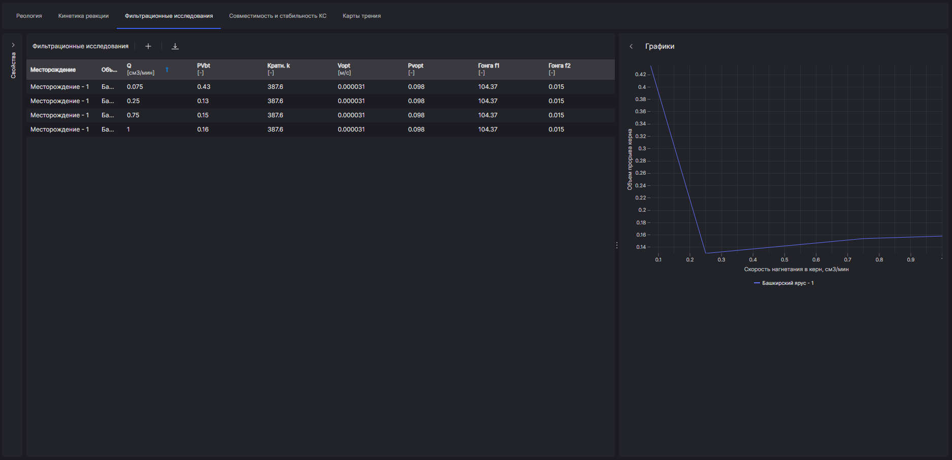Полученные значения и зависимости используются в процессе моделирования кислотных обработок для прогнозирования эффективности и выбора оптимальных параметров воздействия на пласт. Это происходит за счет внесения данных в базу реагентов RockStim.