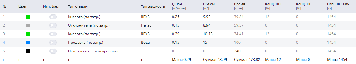 Кислота (по затрубному пространству) 9,93м³ → Отклонитель (по затр.) 8,94м³ → Кислота (по затр.) 10,13м³ → Продавка (по затр.) 15м³
