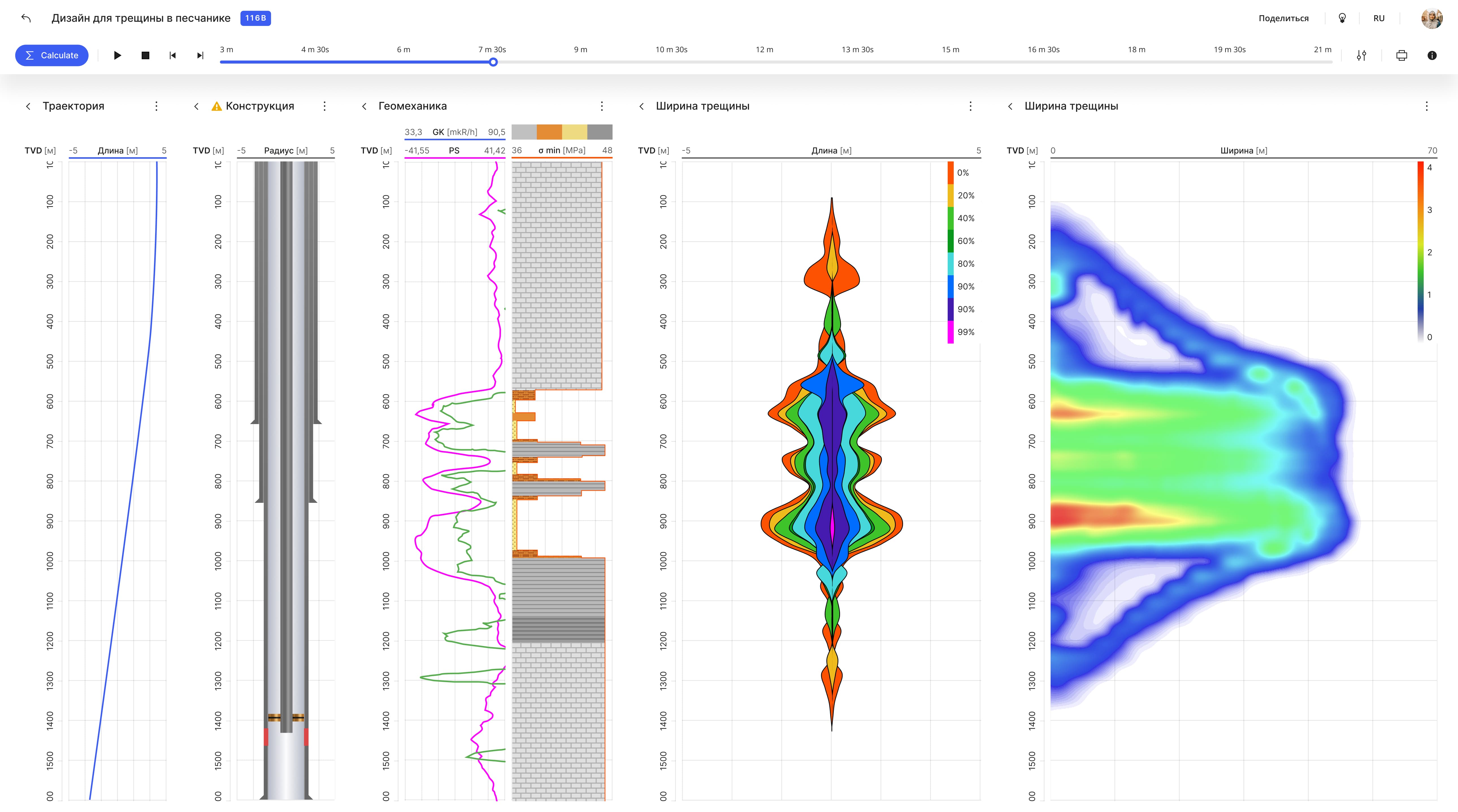 Симулятор гидравлического разрыва пласта выполняет расчет параметров трещин ГРП, определеляет их характеристики для прогноза технико-экономической эффективности мероприятия. Приложение позволяет гибко взаимодействовать с входными данными и настраивать отображение результатов на планшете скважины.